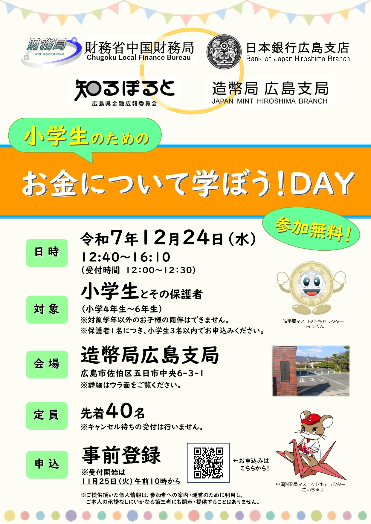 | 主催/共催 | 財務省中国財務局、日本銀行広島支店、広島県金融広報委員会、(独)造幣局広島支局/金融経済教育推進機構(J-FLEC) |